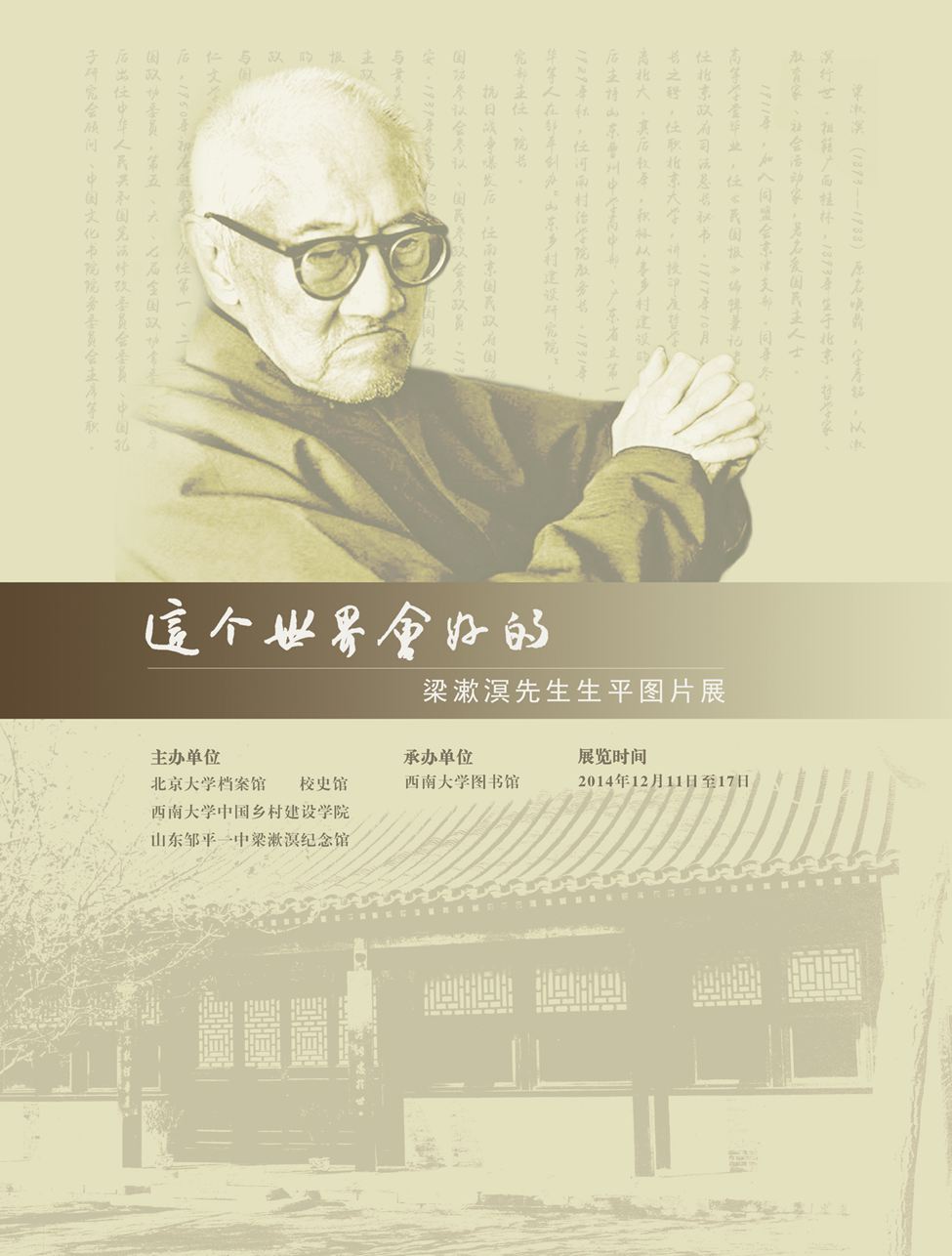 梁漱溟(1893——1988),原名焕鼎,字寿铭,以漱溟行世。祖籍广西桂林,1893年出生于北京。哲学家、教育家、社会活动家,著名爱国民主人士。